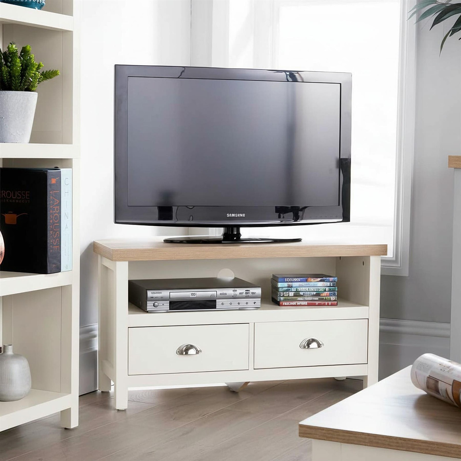 RoselandFurniture Farro Cream Corner TV Stand Unit 90 cm Painted Solid Wood Light Oak Top Television Cabinet Suitable for TVs up to 40 inches for Living Room or Bedroom | Fully Assembled