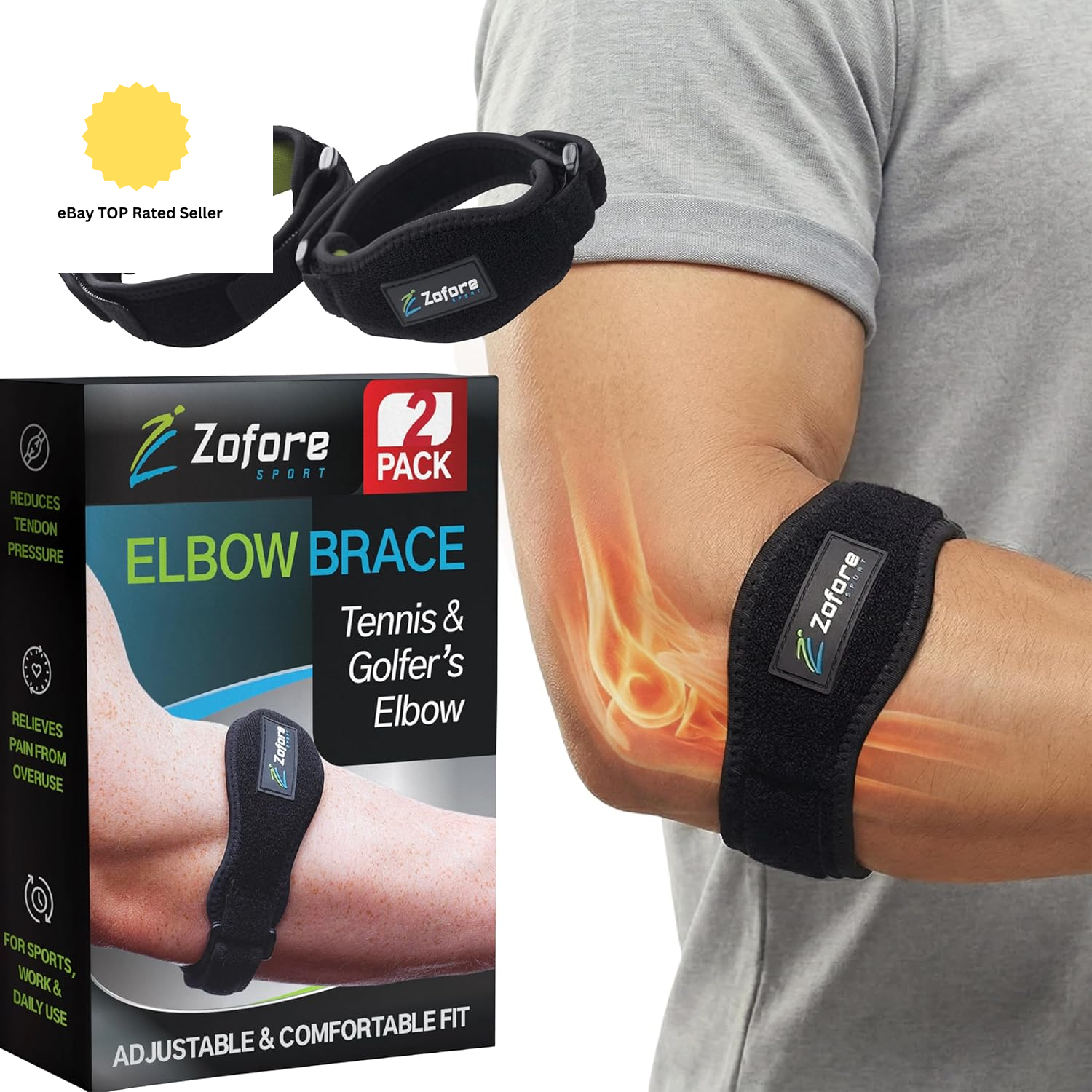 ZOFORE SPORT Tennis Elbow Brace Support With Compression Pad (2-Count) - Effective Pain Relief for Tennis & Golfers Elbow for Men & Women