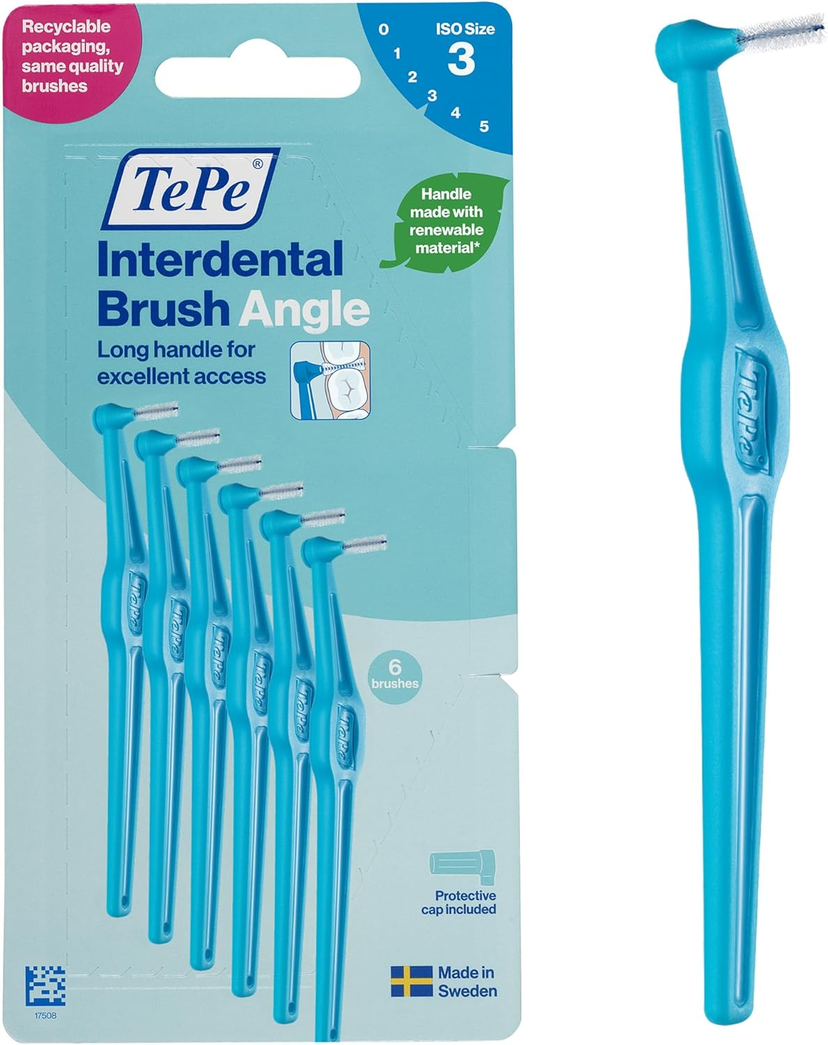 TePe Interdental Brush Angle, Green, 0.8mm/ISO 5, 6pcs, Plaque Remover, Easy and efficient Cleaning Between Teeth, Tooth Floss for Small Gaps, Carton Pack