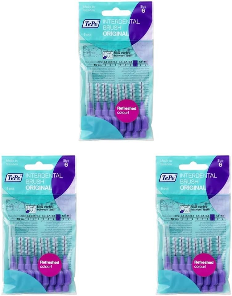 TePe Interdental Brush - Purple 1.10mm, Size 6 - 3 Packs of 8 Brushes - 24 Total