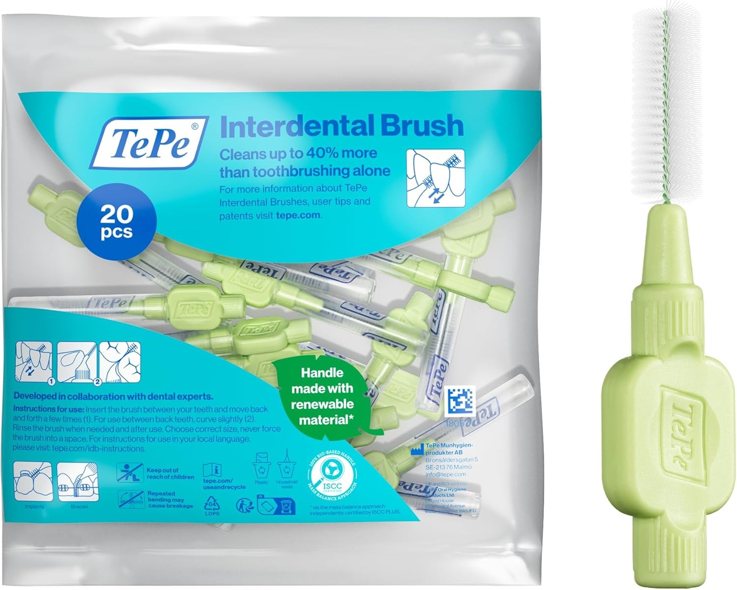 TePe Interdental Brush, Extra Soft, Green, 0.8mm/ISO 5, 20pcs, Plaque Removal,