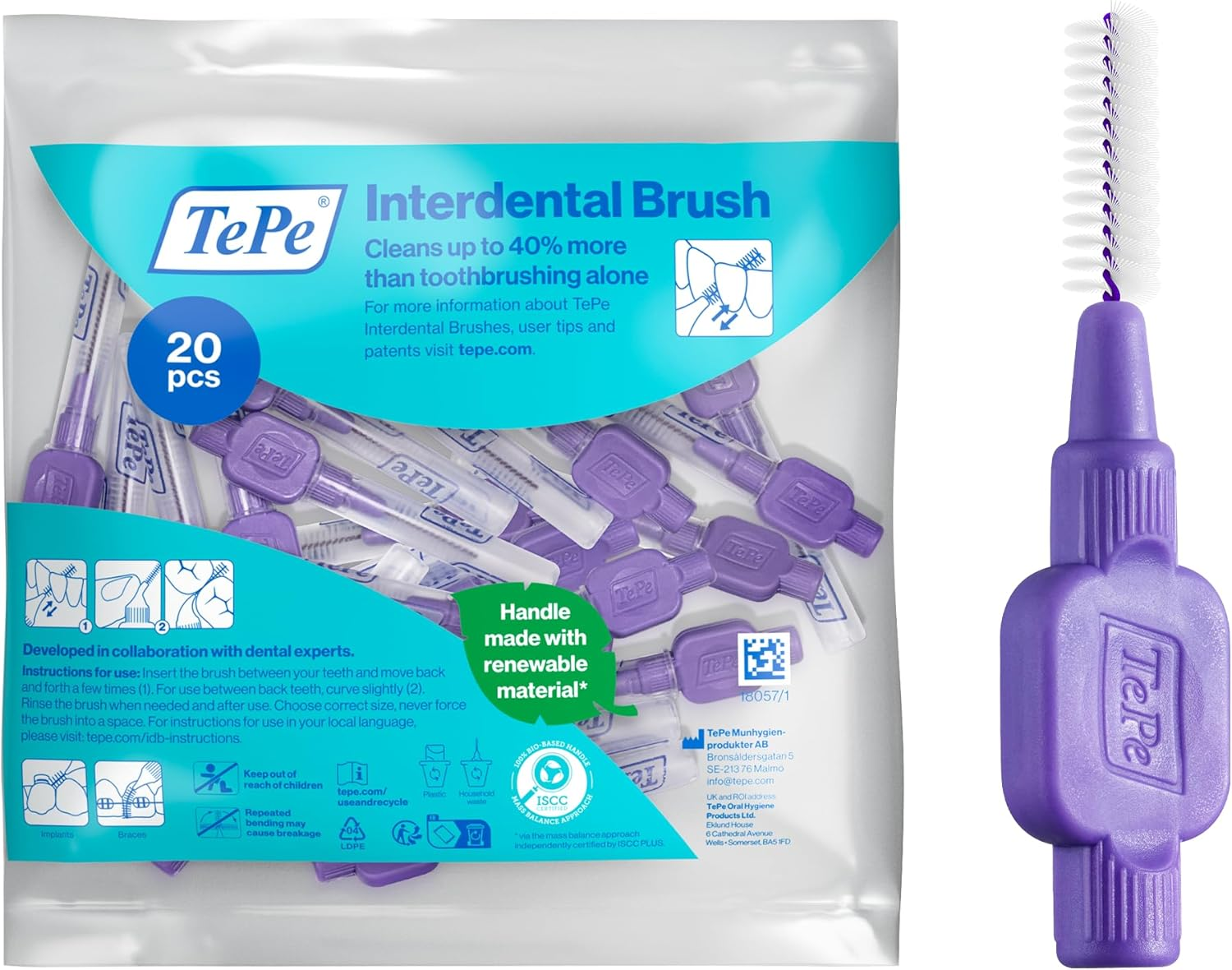 TePe Interdental Brush, Extra Soft, Purple, 1.1mm/ISO 6, 20pcs, Plaque Removal,