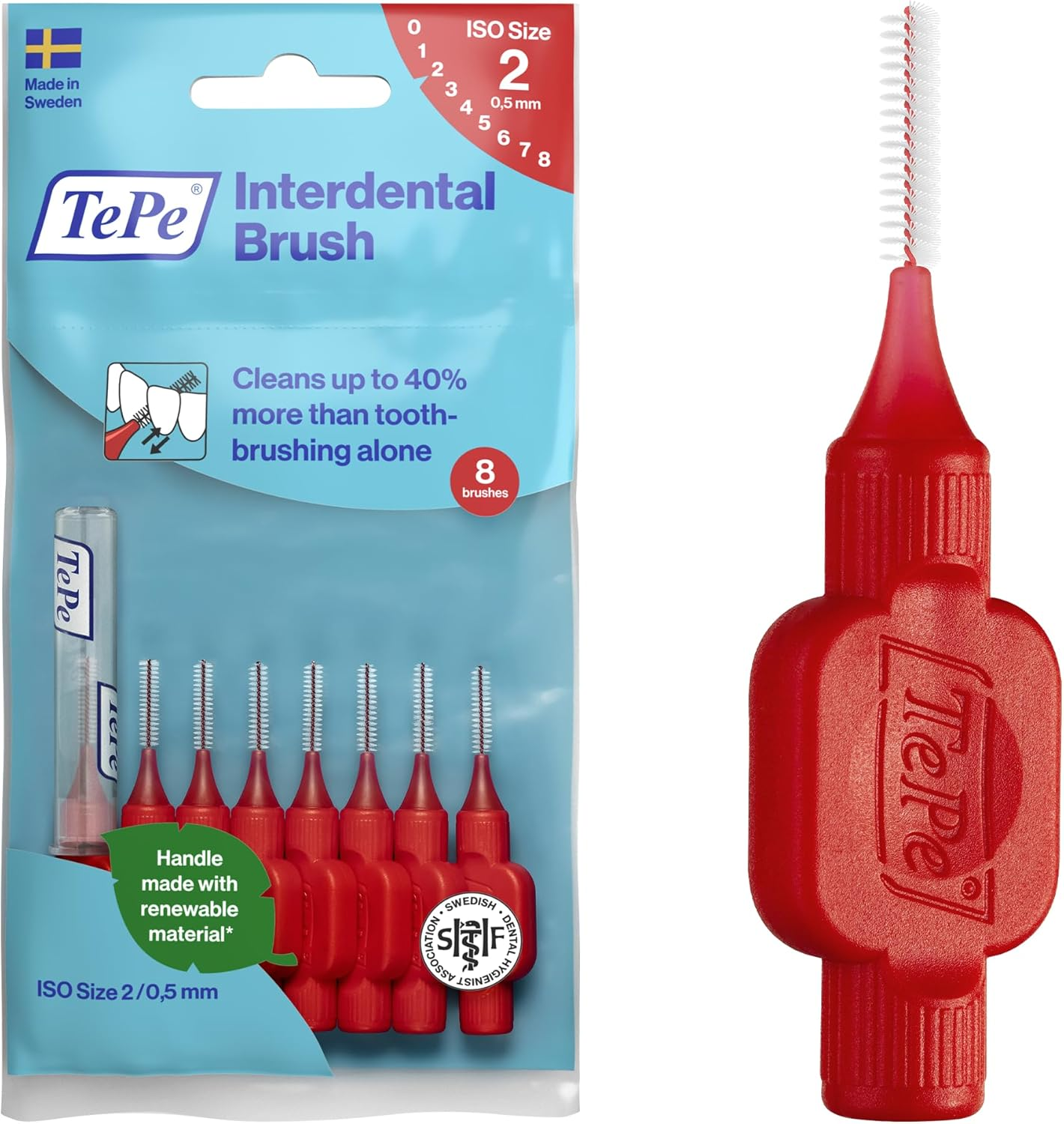 TePe Interdental Brush, Original, Red, 0.5mm/ISO 2, 8pcs, efficient Cleaning Between Teeth, Plaque Remover and Dental flosser for Narrow Gaps