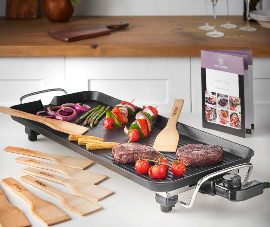 Trendi® Electric Teppanyaki Grill Griddle with 8 Wooden Spatulas - Adjustable Temperature Control - Electric BBQ Table Top Grill - Non Stick Hot Plate - Oil Drip Tray