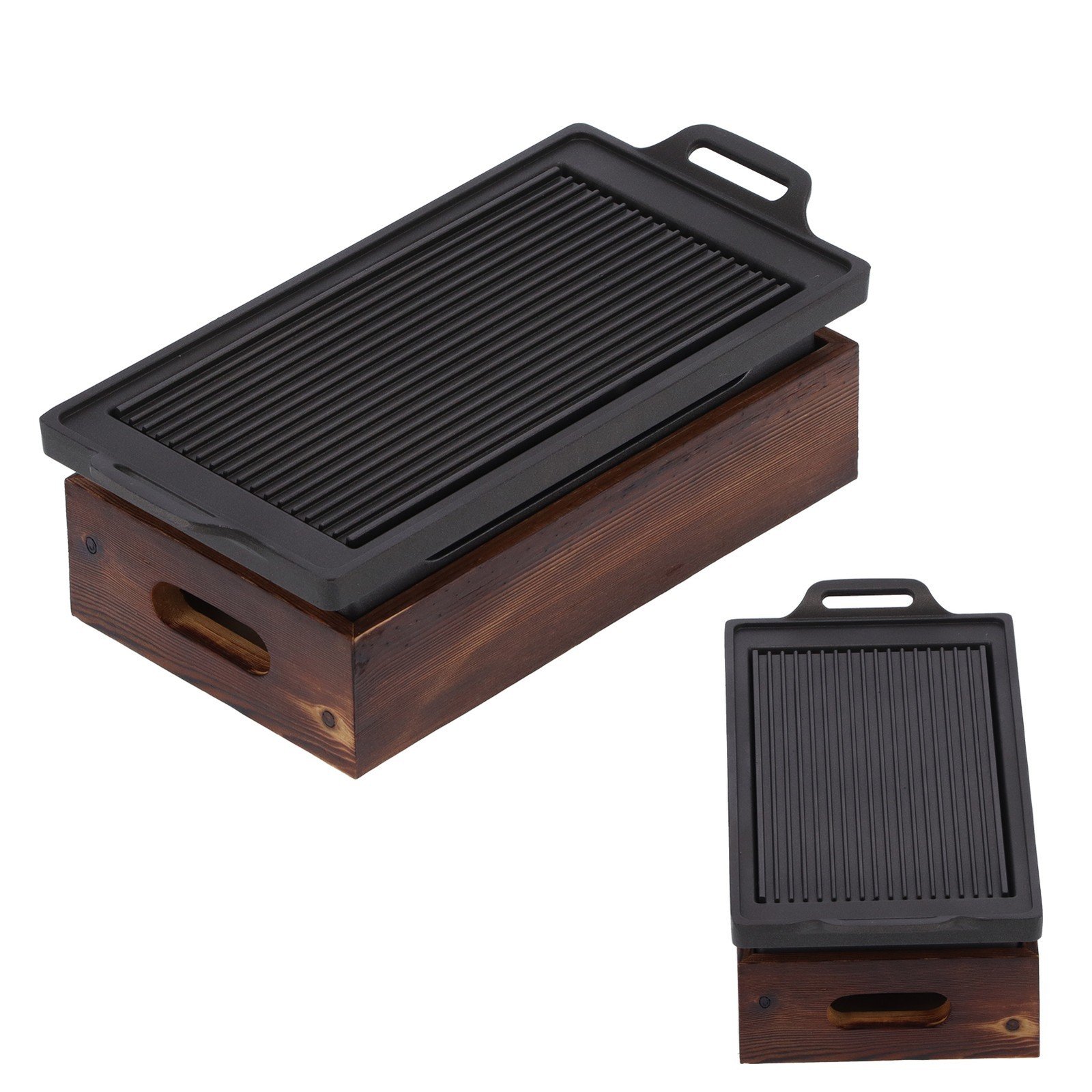 KitchenCraft World of Flavours Japanese Teppanyaki Grill Platter, Cast Iron Sizzling Plate with Wooden Base, 36 x 14.5 x 3.5 cm, Black