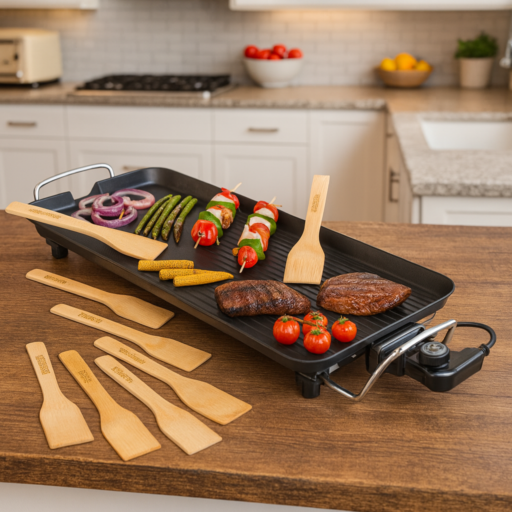 Andrew James Teppanyaki Grill Plate | XL Non-Stick Flat top Grill with Hot Plate | Teppanyaki Electric Griddle with 8 Wooden Spatulas and 2 Cooking