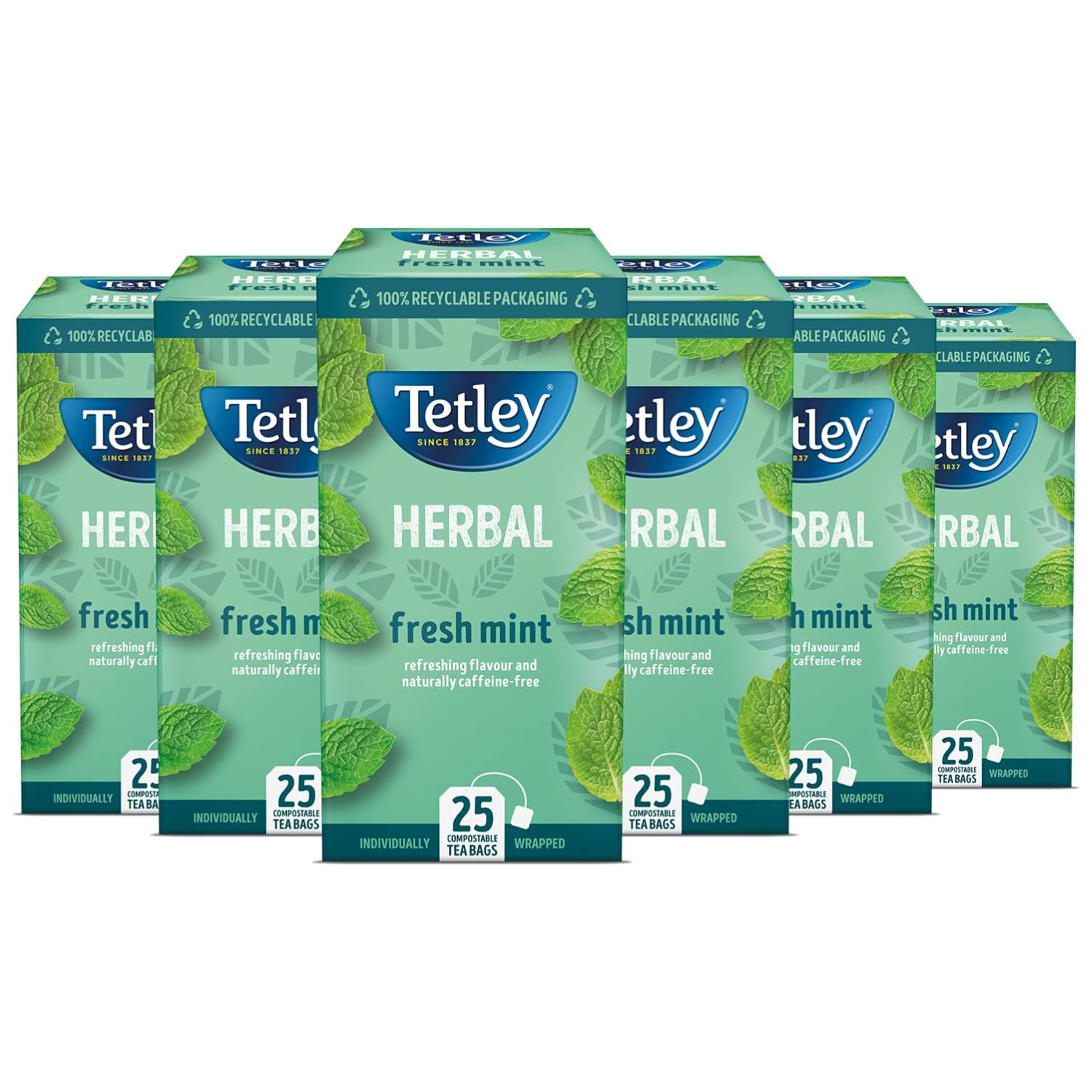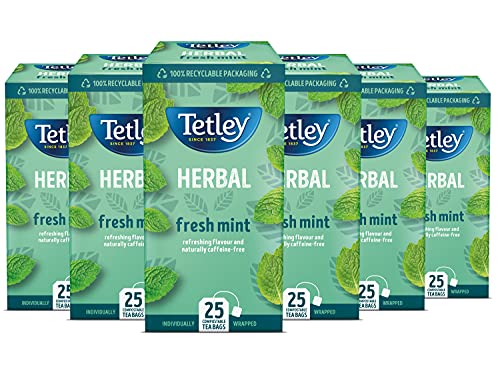 Tetley Fresh Mint Tea Bags - Refreshing Peppermint & Spearmint Blend - Naturally Caffeine-Free - Smooth & Cooling Herbal Infusion - Rainforest Alliance Certified - 150 Teabags (6x25 Pack)