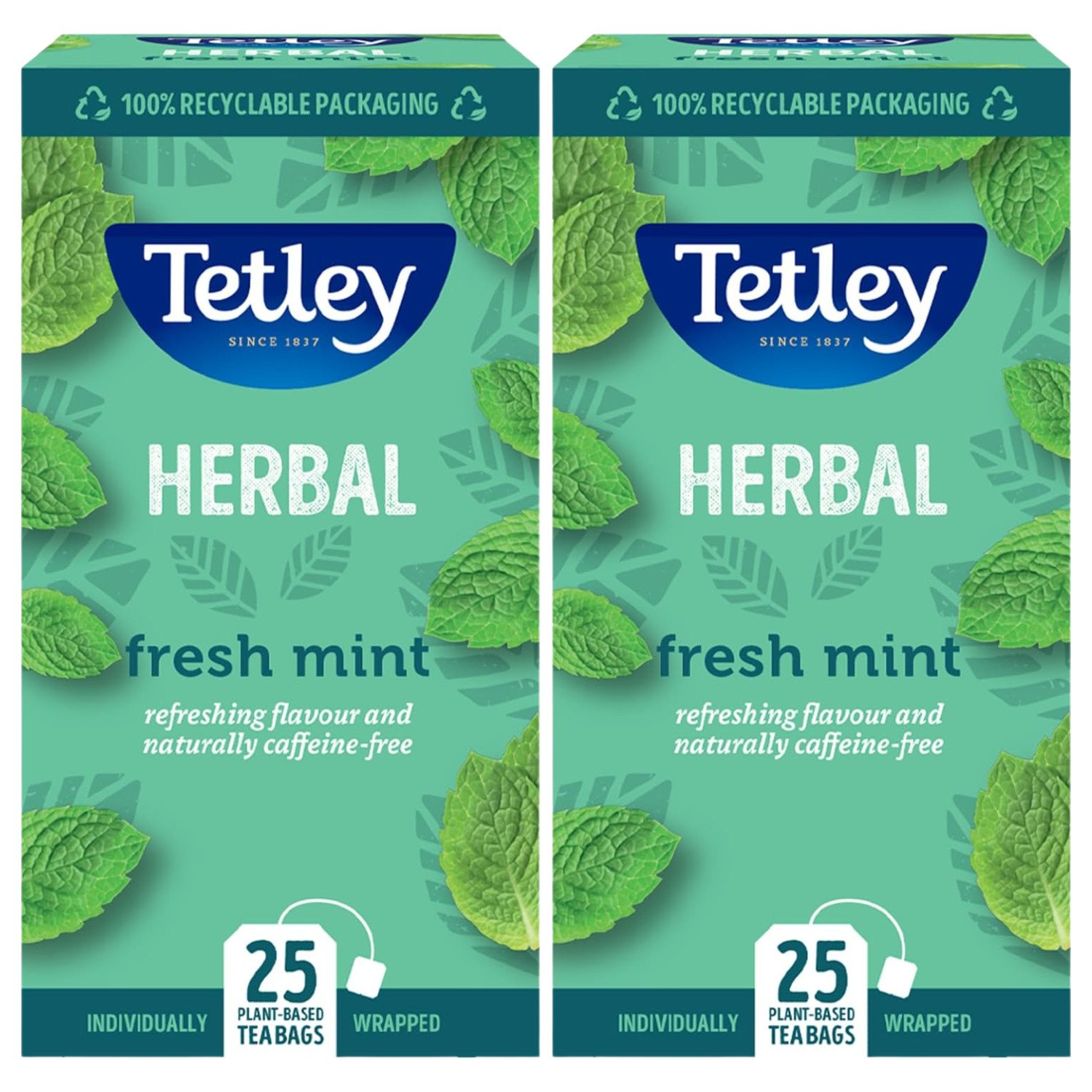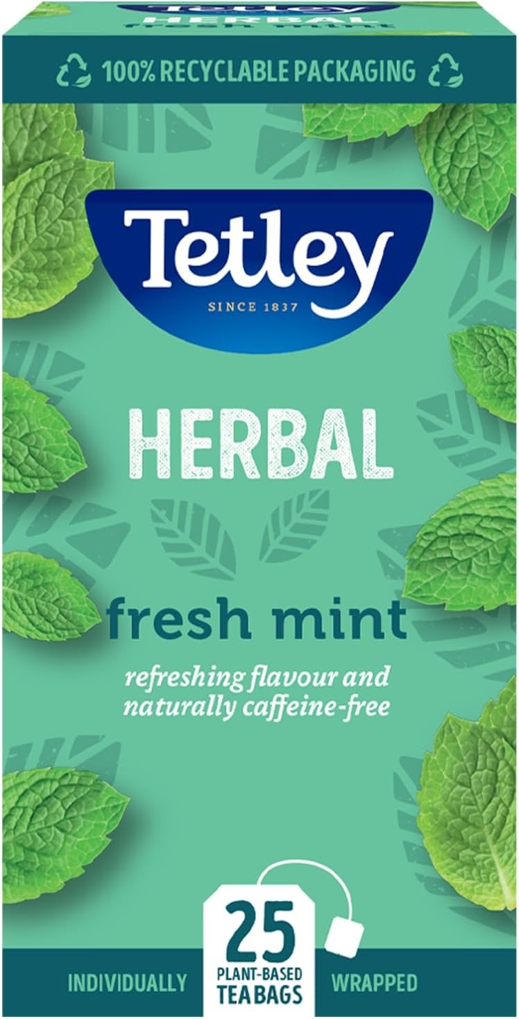 Tetley Fresh Mint Tea Bags - Refreshing Peppermint & Spearmint Blend - Naturally Caffeine-Free - Smooth & Cooling Herbal Infusion - Rainforest Alliance Certified - 25 Teabags (1 Pack)