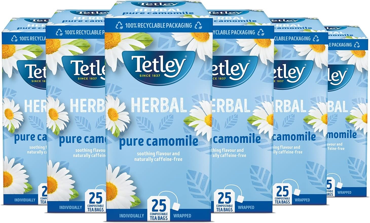 Tetley Pure Camomile Tea Bags - Gentle & Floral Herbal Infusion - Naturally Caffeine-Free - Relaxing & Soothing - Rainforest Alliance Certified - 150 Individually Wrapped Teabags (6x25 Pack)