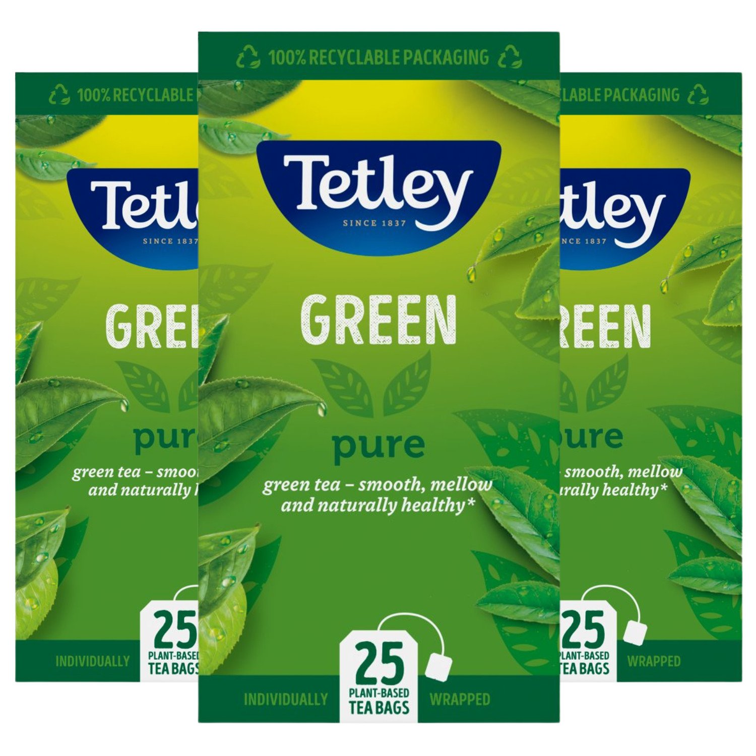 Tetley Tea Green Tea Bags Pure Green Individually Wrapped Sachets x3