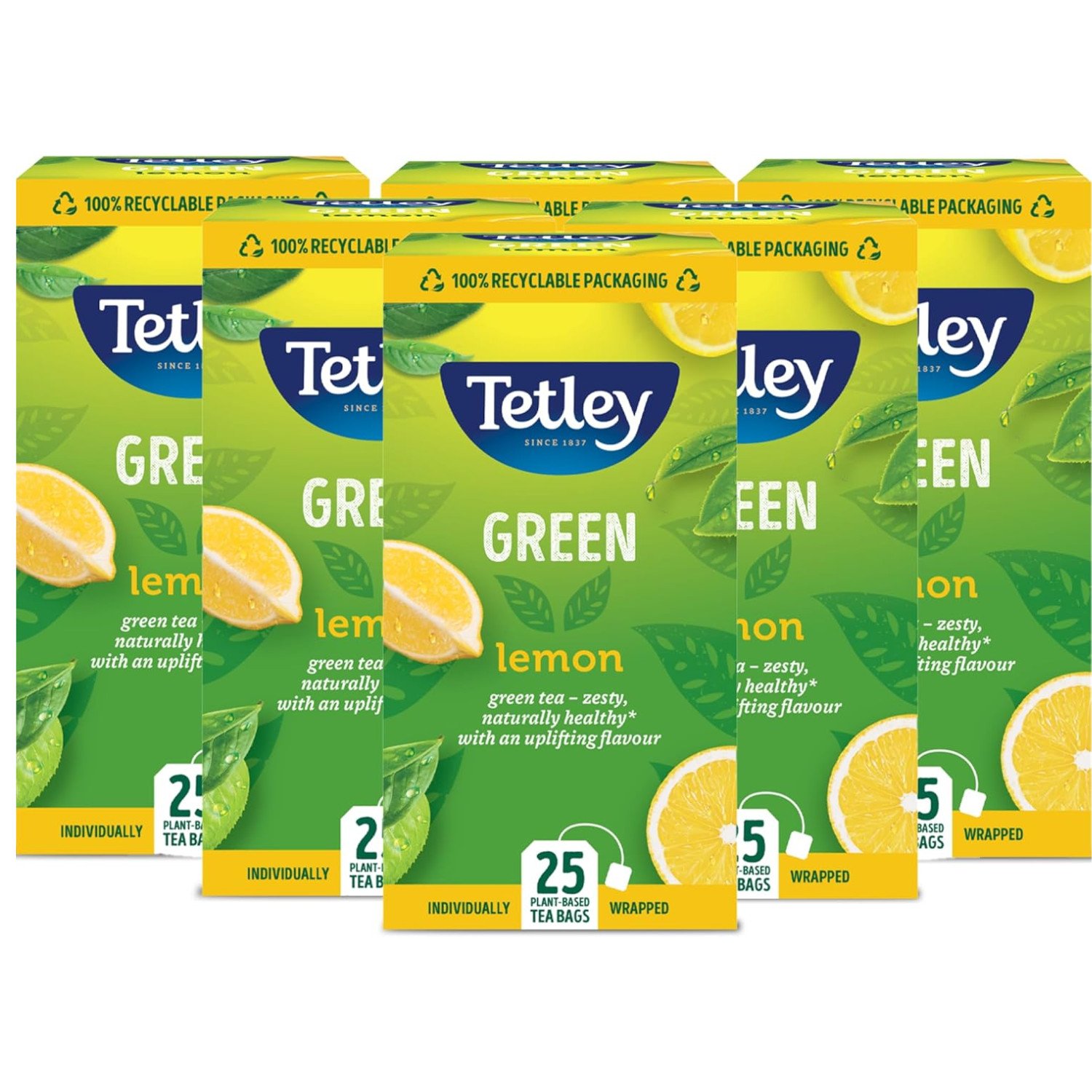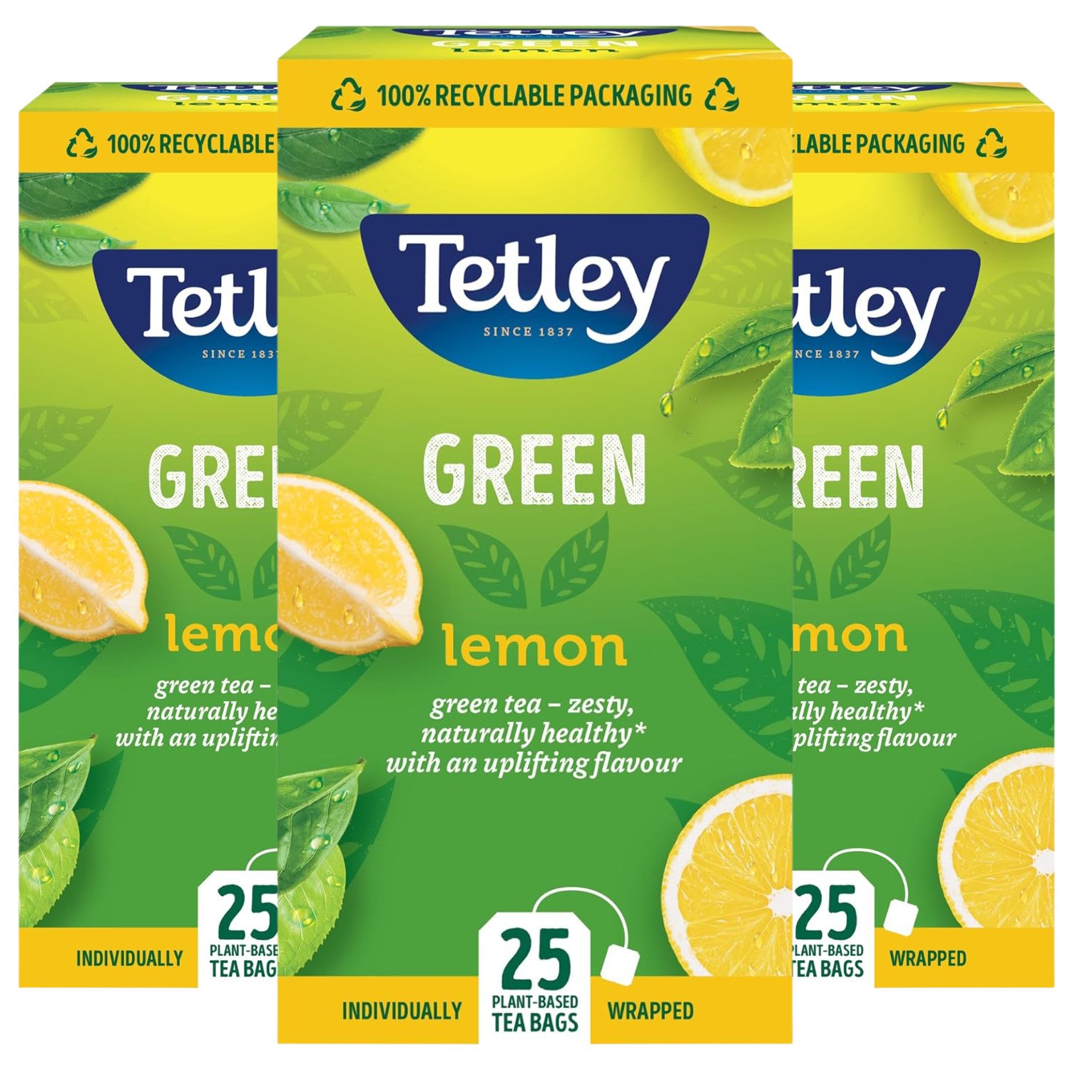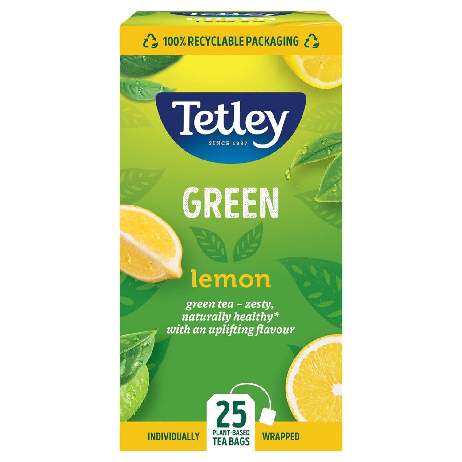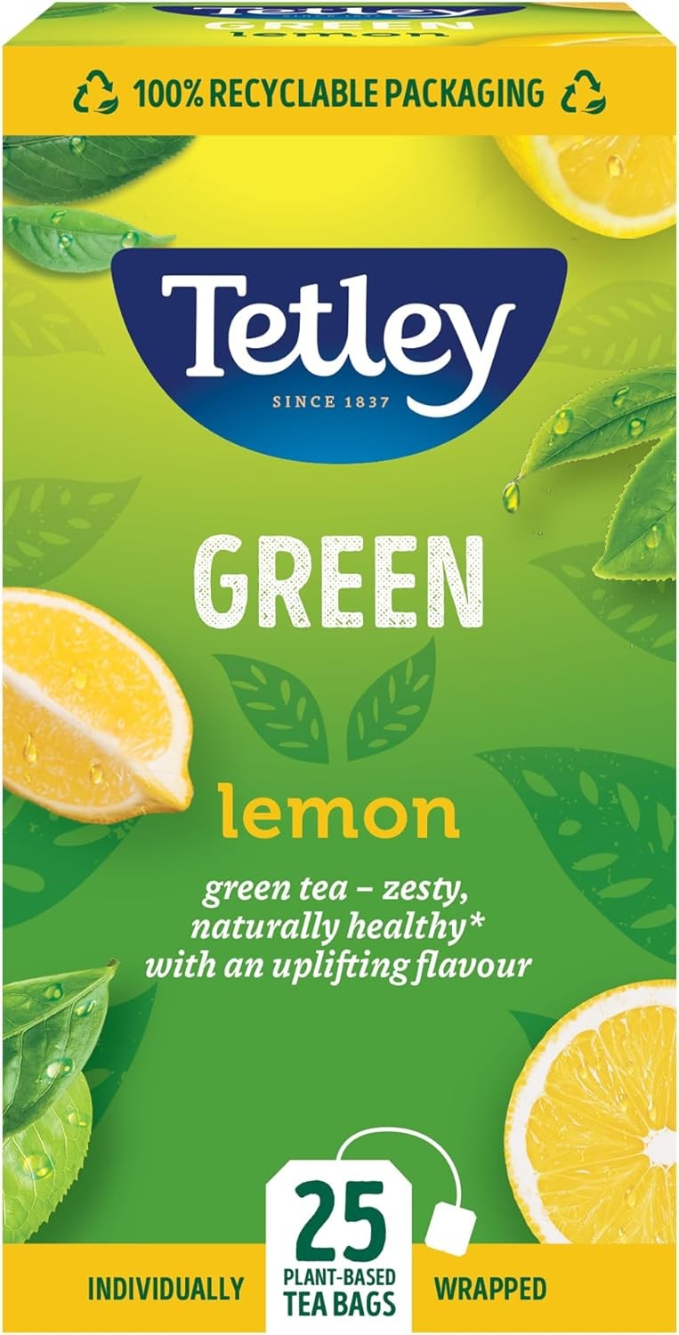 Tetley Lemon Green Tea Bags - Refreshing & Healthy Citrus Blend - Rainforest Alliance Certified - Plant Based Tea Bags - Perfect for a Relaxing Moment - 25 Teabags (1 Pack)