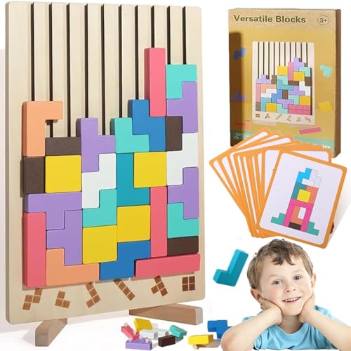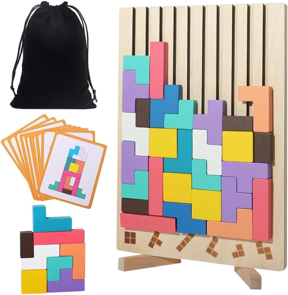 Eldvinur Wooden Stacking Puzzle Toy,Tetris Game,3D Puzzles with 10 Cards,Colorful Intelligence Building Block Toys,Wooden Tetris Puzzle,Educational Stacking Game for Fun Parent-Child Activities
