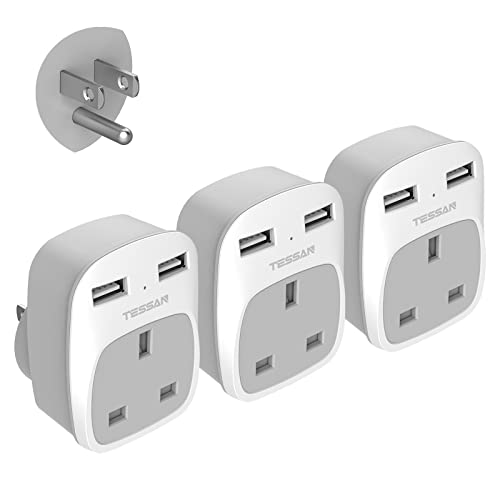UK to US Plug Adapter with 3 USB Ports, TESSAN 2 Way Grounded USA Travel Adapter, Double Plug Adaptor from UK to America, Canada, Thailand, Mexico, Canada, Thailand, Cuba(Type B), 3 Pack