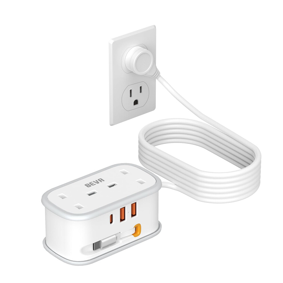 UK to US Plug Adapter with 1.5M Extension Cable, BEVA 2 Way 3 USB (2A+1C) Travel Adapter with Retractable USB C Cable for American, Thailand, Canada,