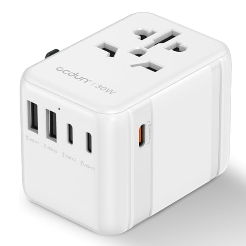 ocdun Universal Travel Adapter with 3 USB-C Ports (1 PD 30W), 2 USB-A Ports & AC Socket – Worldwide Plug Adapter for UK, EU, USA, Australia, Thailand & More (White, 30W)