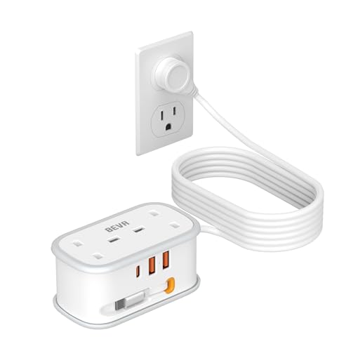 UK to US Plug Adapter with 1.5M Extension Cable, BEVA 2 Way 3 USB (2A+1C) Travel Adapter with Retractable USB C Cable for American, Thailand, Canada, Mexico, Type B