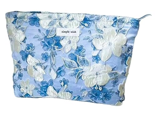 The Cedar Tree Sky Blue and White Floral Large Makeup Bag Wide-Open Zipper Pouch Travel Wash Bag Makeup Toiletry Cosmetic Organizer Bag for Women