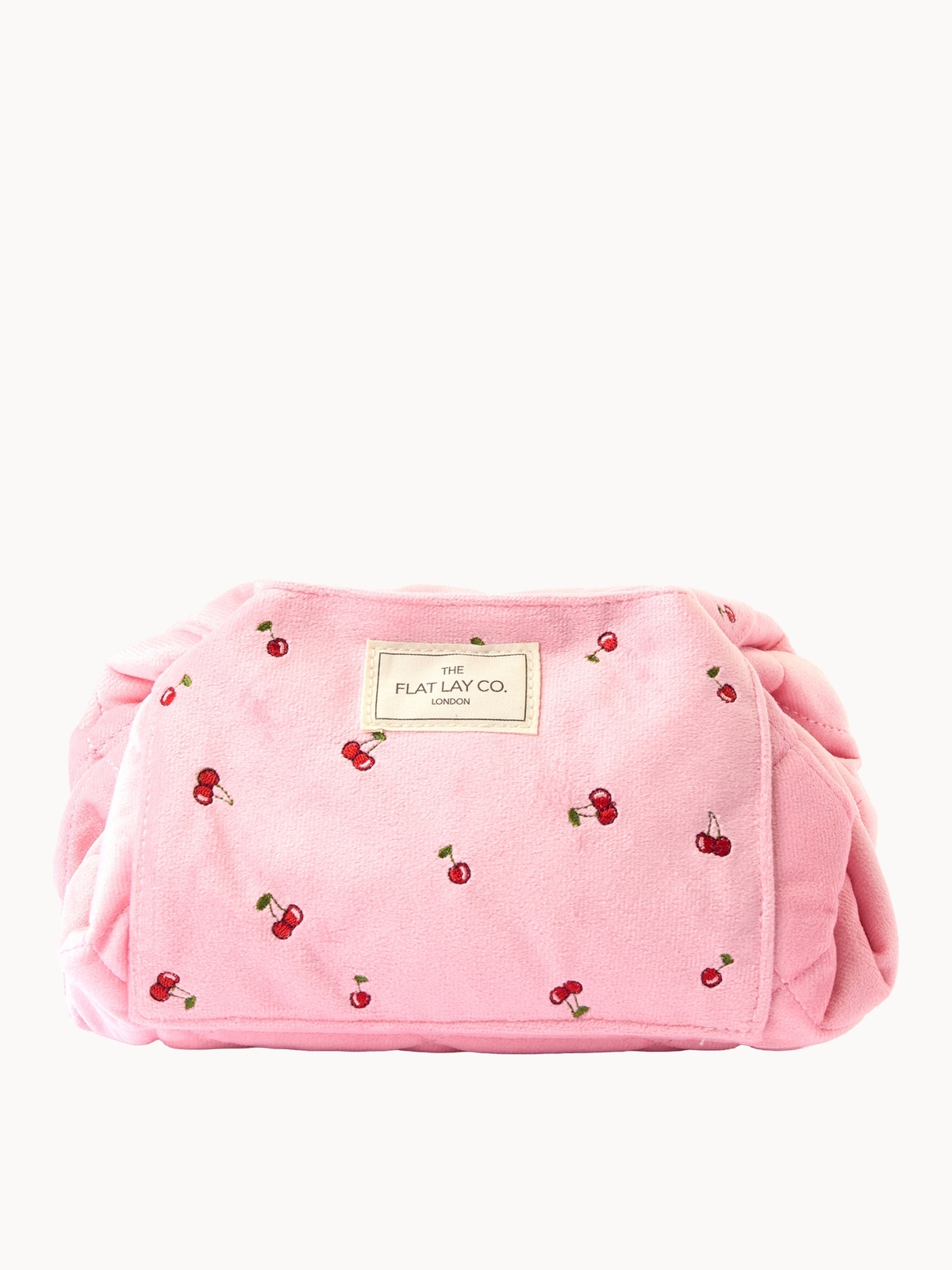 The Flat Lay Co. Drawstring Flat Lay Makeup Bag - Ditsy Cherries Pink Embroidered Velvet