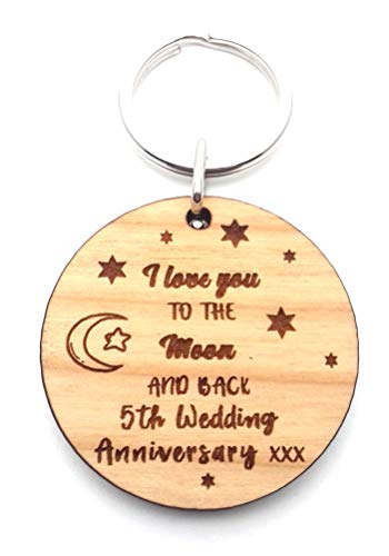 5th Wedding Anniversary I Love You to The Moon and Back Wooden Wood Keyring Key Ring for Her Him Wife Husband