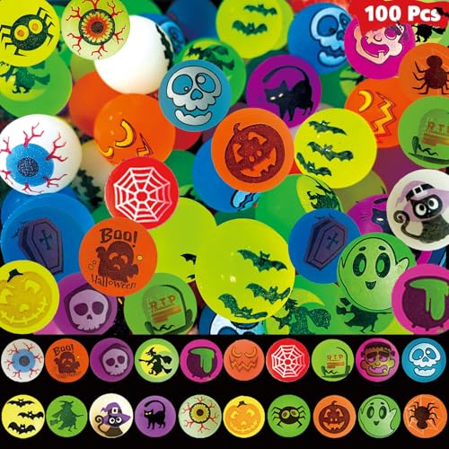 100 Piece Halloween Glow in The Dark Bouncing Balls, 20 Halloween Theme Designs Bouncing Balls for Kids, Party Supplies Party Favors, Trick or Treating Goodies