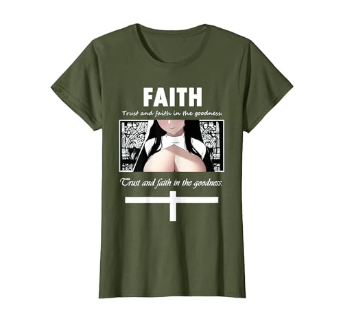 Trust and Faith in The Goodness Anime Nun Anime Girl Otaku T-Shirt, Women, Olive Green, Large