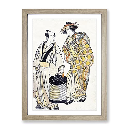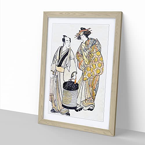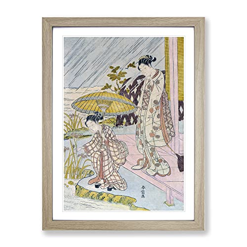 Admiring An Iris In The Rain By Harunobu Suzuki Asian Japanese Framed Wall Art Print, Ready to Hang Picture for Living Room Bedroom Home Office Décor, Oak A2 (64 x 46 cm)
