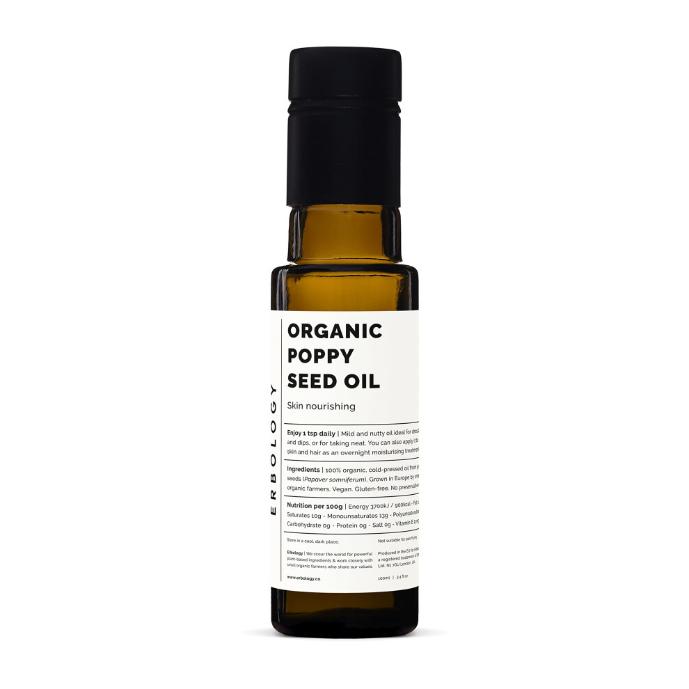 Erbology Organic Poppy Seed Oil 100ml - Cold-Pressed - Calming and Nourishing the Skin - Antioxidant - High in Vitamin E - Straight from Farm -