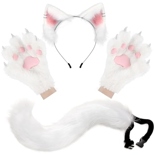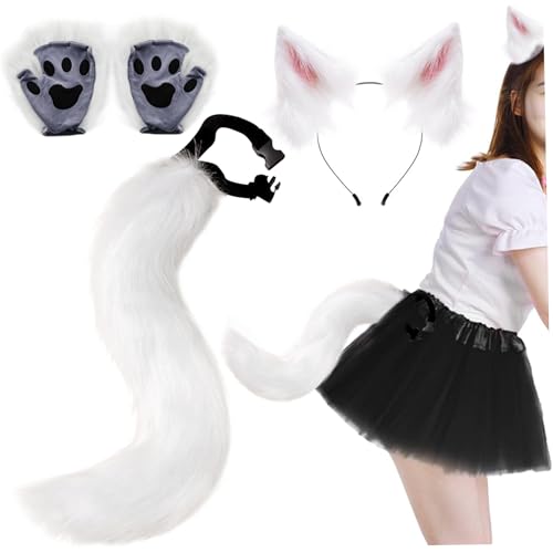 Whyzsjnclg Fox Ears And Tail, Fox Ears and Tail Therian Paws, 3 Pack Faux Fur Therian Gear, Fluffy Funny Costume Adult Women Men for Role Play Party White