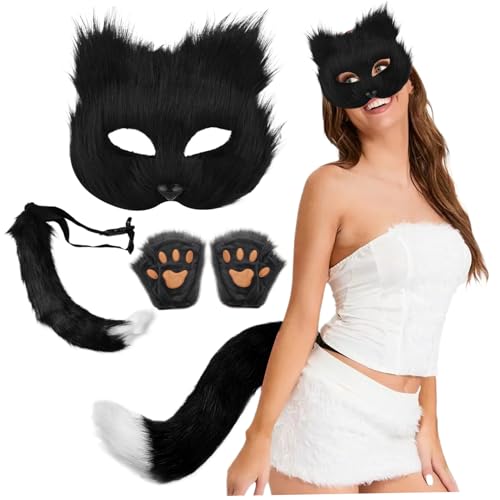 Therian Mask Tail Gloves Paw Set Animal Gear Cat Fox Wolf Masks Dress Up Cosplay Party Women Furry Faux Fur Fingerless (Pure Black)