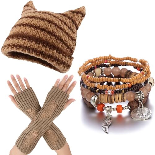 Therian Gear Y2K Clothes,Grunge Clothing - Emo Beanie, Fingerless Gloves,Five Fairycore Bracelets, Brown, One Size