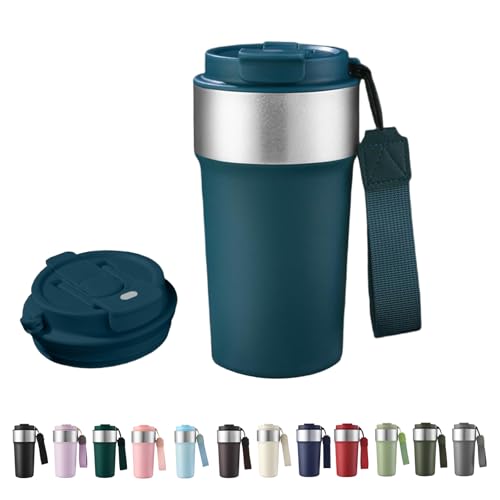 HHZalvyre Insulated Travel Mug 510ml, Leakproof Stainless Steel Thermal Coffee Cup with Carry Strap, 3 Drinking Modes, Keeps Hot/Cold for Hours, Car Office Commute Mug, Gift Idea (Peacock Blue)