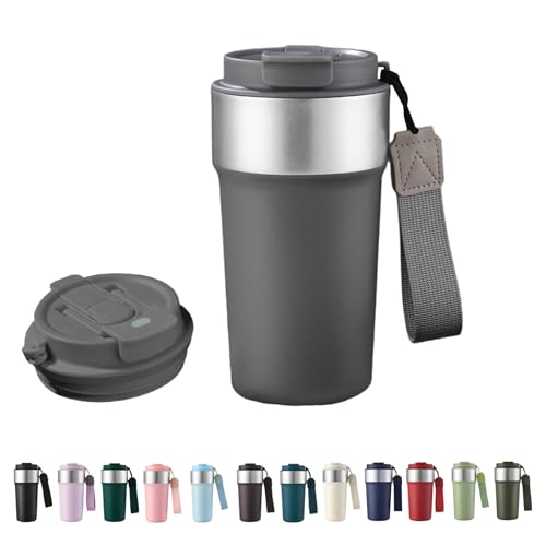 HHZalvyre Insulated Travel Mug 510ml, Leakproof Stainless Steel Thermal Coffee Cup with Carry Strap, 3 Drinking Modes, Keeps Hot/Cold for Hours, Car Office Commute Mug, Gift Idea (Grey)