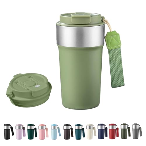 HHZalvyre Insulated Travel Mug 510ml, Leakproof Stainless Steel Thermal Coffee Cup with Carry Strap, 3 Drinking Modes, Keeps Hot/Cold for Hours, Car Office Commute Mug, Gift Idea (Avocado Green)