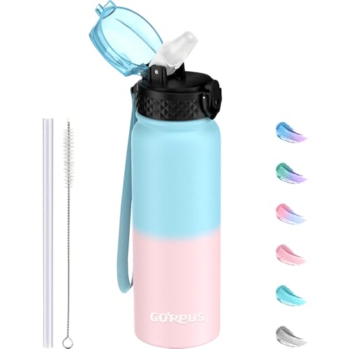 GOPPUS 600ml/20oz Stainless Water Bottle with Straw Double Wall Insulated Bottles with Strap Reusable Vacuum Thermal Flask Leakproof Keep Cold Drinks Bottles with Flip Top Lid for Men Women BPA Free