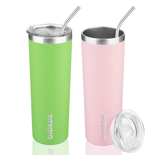 BJPKPK 20 oz Skinny Tumbler with Lid 2 Pack Slim Insulated Travel Coffee Cup Stainless Steel Thermal Mug,Green,Light Pink