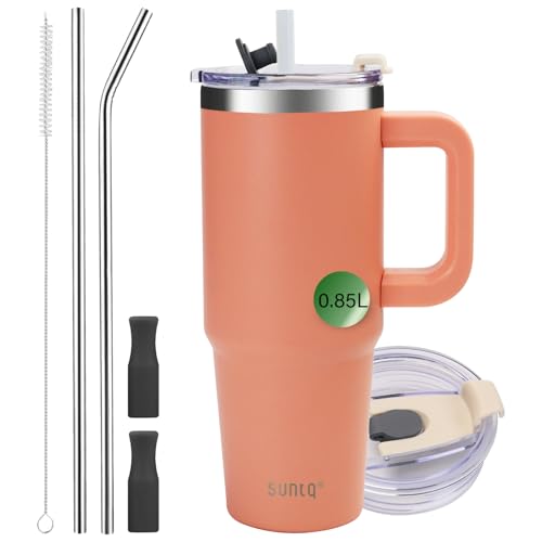 SUNTQ 30oz Tumbler with Handle, Double Wall Vacuum Insulated Water Bottle with Straw and Lid, Stainless Steel Travel Coffee Mug, Reusable Thermal Cup for Beverages, Fit in Cup Holder(Peach Pink)