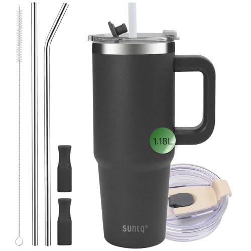 SUNTQ 40oz Tumbler with Handle, Double Wall Vacuum Insulated Water Bottle with Straw and Lid, Stainless Steel Travel Coffee Mug, Reusable Thermal Cup for Beverages, Fit in Cup Holder(Black)