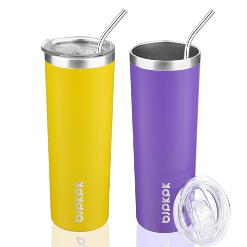 BJPKPK 20 oz Skinny Tumbler with Lid 2 Pack Slim Insulated Travel Coffee Cup Stainless Steel Thermal Mug,Purple,Goldenrod