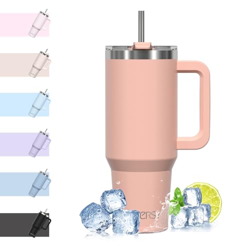 SUNTQ 40oz Tumbler with Handle, Double Wall Vacuum Insulated Water Bottle with Straw and Lid, Stainless Steel Travel Coffee Mug, Reusable Thermal Cup for Beverages, Fit in Cup Holder(Peach Pink)