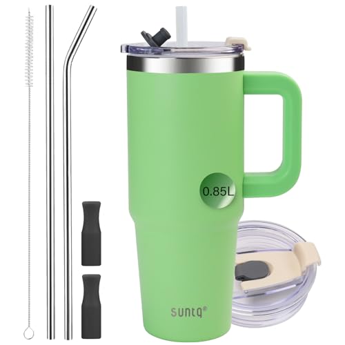 SUNTQ 30oz Tumbler with Handle, Double Wall Vacuum Insulated Water Bottle with Straw and Lid, Stainless Steel Travel Coffee Mug, Reusable Thermal Cup for Beverages, Fit in Cup Holder(Green)