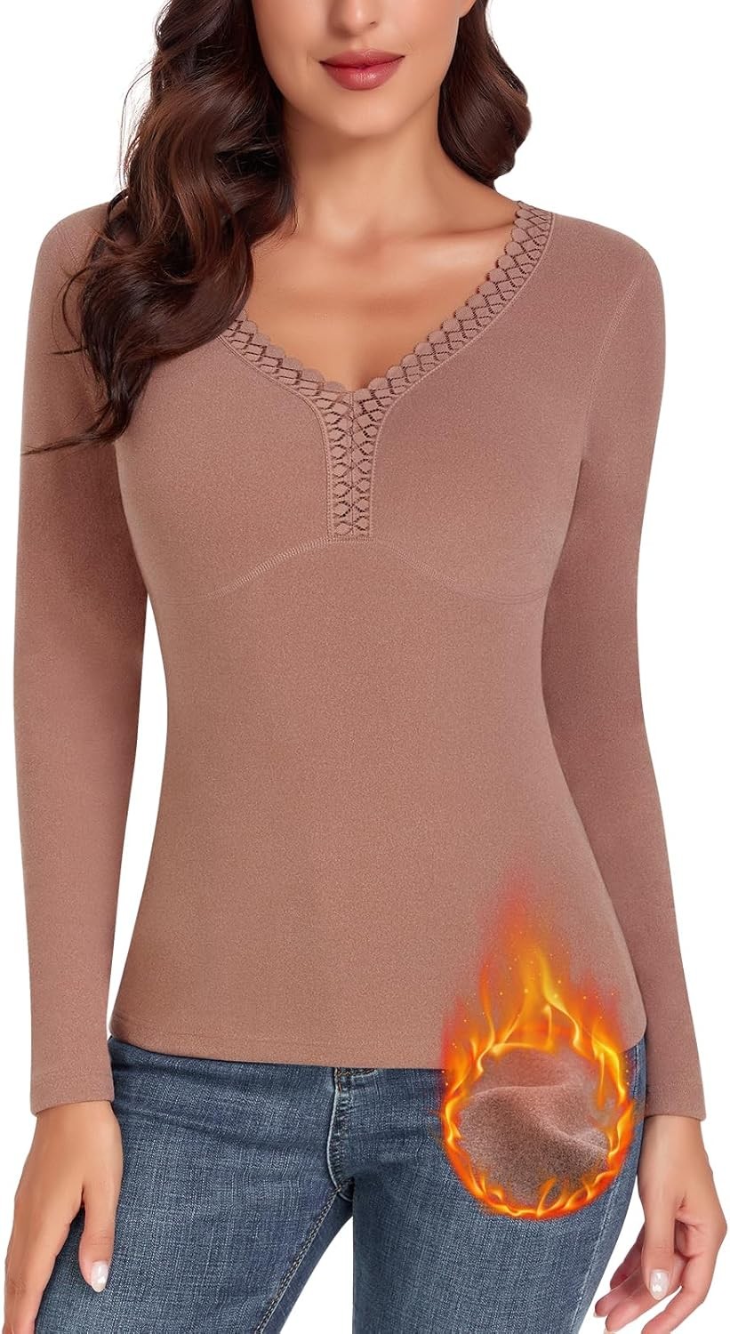 Soneven V Neck Thermal Tops Womens Long Sleeve T Shirts Warm Ladies Vests Base