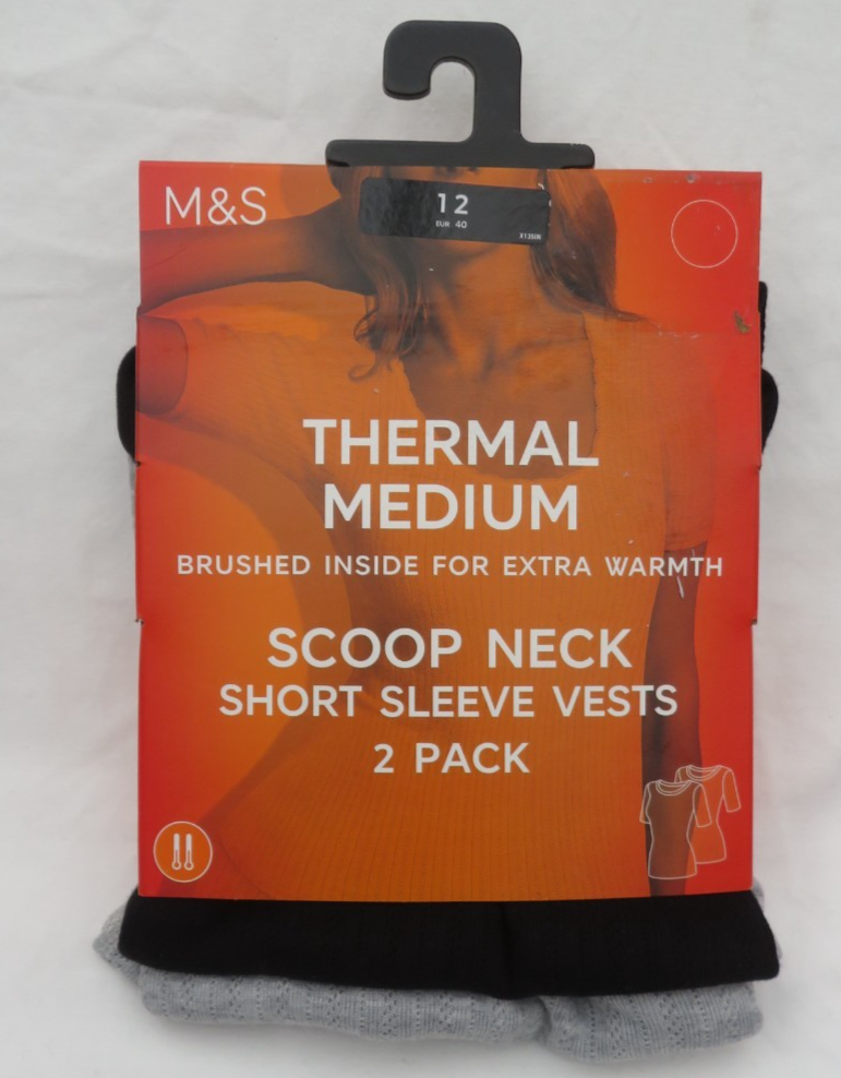 LADIES MARKS AND SPENCER BLACK & GREY THERMAL SHORT SLEEVE VESTS 2 PACK SIZE 12