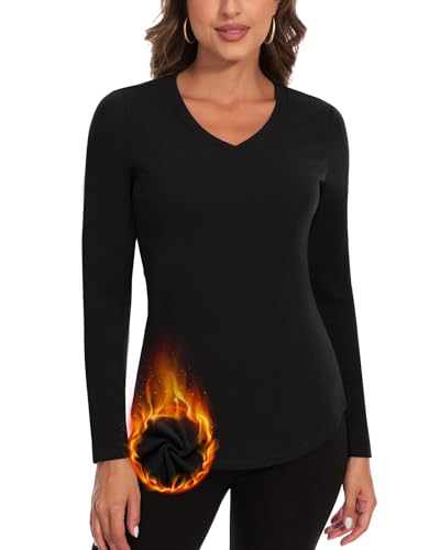 Soneven V Neck Thermal Tops Womens Long Sleeve T Shirts Warm Ladies Vests Base Layers Underwear Gym Tops in Winter/Autumn V-Black M