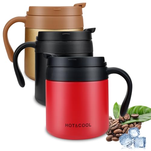 Coffee Cup 350ml, Thermal Coffee Travel Mug with Handle and Lid, Reusable Double Walled Stainless Steel Insulated Coffee Mug, Portable Coffee Flask Fits Car Cup Holders/Outdoor/Office/School, Red 12oz