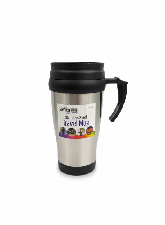 Thermal Travel Mug Silver Stainless Steel Insulated With Lid & Handle 400ml