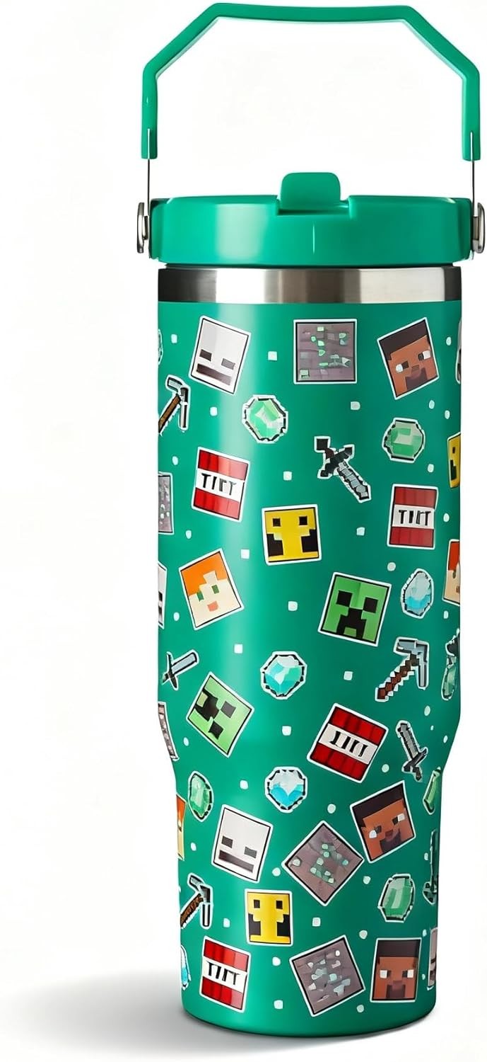 Minecraft 900ml Thermal Travel Mug Water Bottle Tumbler - Leakproof Straw & Lid - Stainless Steel Vacuum Insulated | Cold for 17Hrs - Hot for 5Hrs, Green