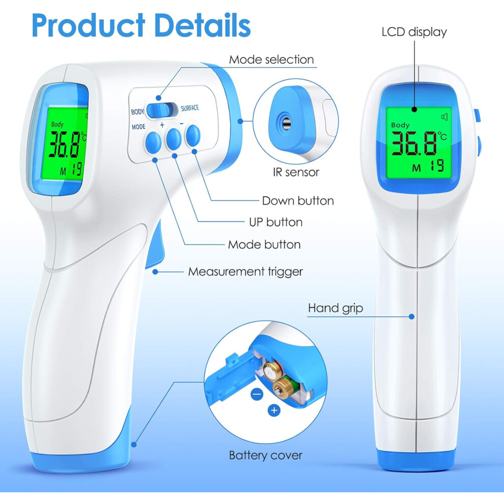 Thermometer for Adults and Baby, Non Contact Forehead Digital Thermometer with Instant Reading, Fever Alarm, LCD Display, °C/℉ Switch for Room & Surface Temperature, Ideal for Home & Travel