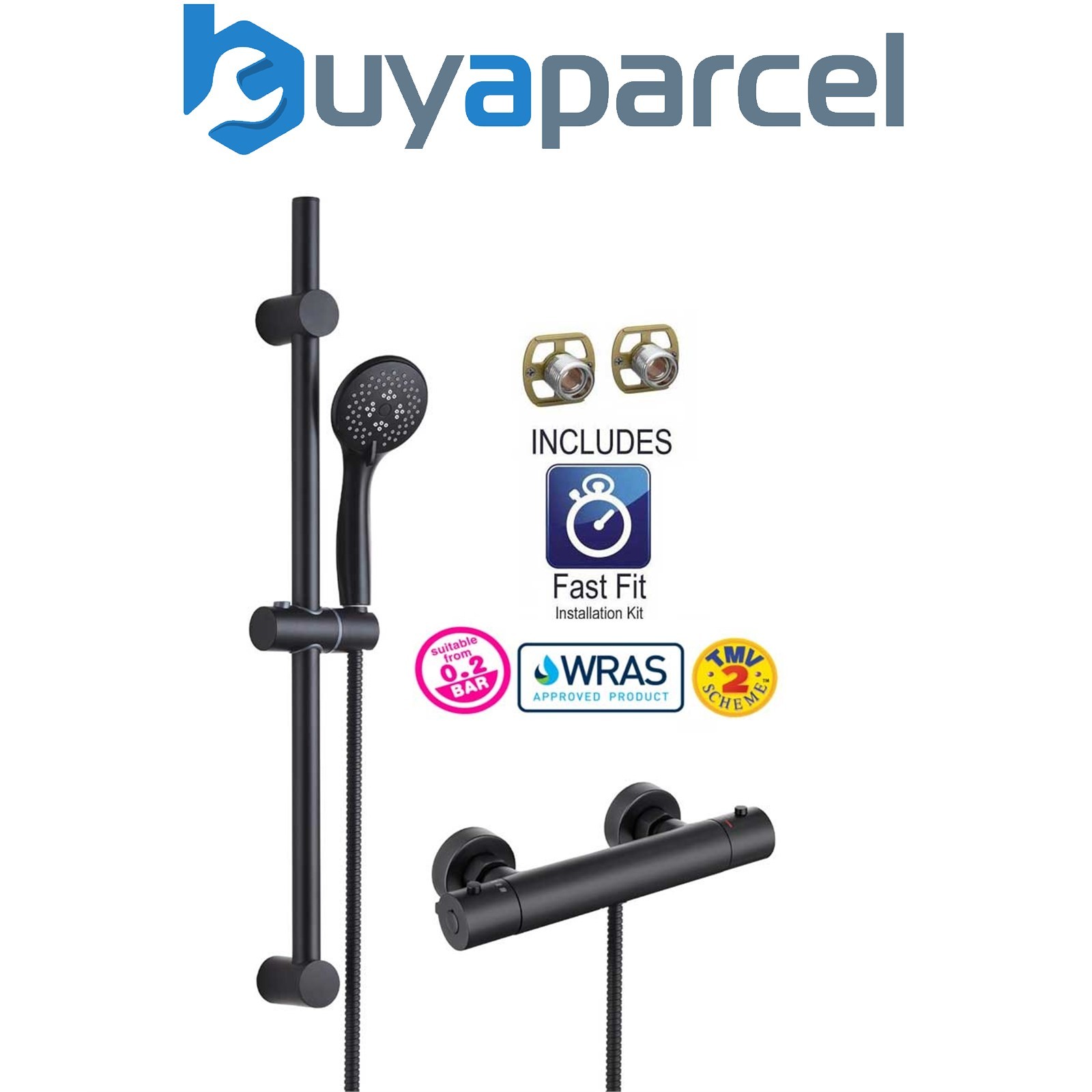 Matt Black Thermostatic Round Bar Mixer Shower Valve + Riser Kit + Fast Fit Kit