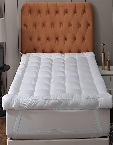 Threads For Bed Extra Thick Mattress Topper Single Bed 100% Cotton Fabric, 3 Inch Gusset Overfilled Soft Mattress Bed Topper Pad with Elastic Corner Straps, Baffle Box Stitched, Machine Washable