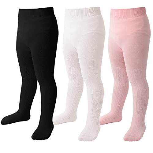 Marchare Baby Girls Tights Thick Solid Cable Knit Leggings Winter Warm Stockings For Toddler Girls 2-4T Black/Ivory White/Pink 3 Pack